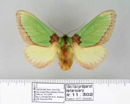 Limacodidae Limacodidae (Schneckenspinner, Asselspinner oder Schildmotten) Die Limacodiden sind eine Familie von Nachtfaltern in der Überfamilie Zygaenoidea bzw. Cossoidea. Mit den näher verwandeten Megalopygidae, Dalceridae, und Aididae bilden sie die „Limacoden“-Gruppe. Man unterteillt die Limacodidae in die Unterfamilien Limacodinae und Chrysopolominae. Letzere, in den Tropen Afrikas verbreitet, werden von manchen Autoren auch als eigenständige Familie betrachtet. Die Familie ist weltweit mit etwa 1500 beschriebenen und wahrscheinlich vielen noch nicht beschriebenen Arten beheimatet. Ihr Hauptverbreitungsgebiet sind die Tropen und Subtropen. Die Falter werden wegen ihrer Raupen auch oft Schneckenmotten genannt, weil diese eine äußere Ähnlichkeit mit Schnecken aufweisen. Wegen der Form ihrer Kokons nennt man sie auch Schildmotten. Es handelt sich um kleinere bis mittelgroße behaarte nachtaktiven Motten mit Flügelspannweiten von 16‒32 Millimetern. Ihr Körper ist robust gebaut, die Körperform ist gedrungen. Ihre in Ruhestellung dachartig an den Körper angelegten kurzen und breiten Vorderflügel sind lediglich 1,5‒2 mal länger als breit. Meist sind sie einfarbig braun, grünlich oder metallisch glänzend. Flügelmuster und Färbung haben einen sehr charakteristischen seidigen Glanz. Nordamerikanische Arten sind mehrheitlich kryptisch braun, manchmal auch mit weißen oder grünen Mustern. Die in ihrer Form den Vorderflügeln ähnlichen Hinterflügel sind stark abgerundet. Die Falter sind nachtaktiv. Allen Arten fehlt der Saugrüssel. Da sie keine Nahrung aufnehmen können, haben sie eine nur sehr kurze Lebenserwartung von etwa einer Woche. Dieser Zeit nutzen sie einzig und allein, um sich fortzupflanzen. Die Fühler sind kurz und erreichen in etwa nur die Hälfte der Länge der Vorderflügel. Bei den Männchen gibt es sowohl Arten mit fadenförmigen als auch mit gekämmten Fühlern. Die Maxillarpalpen sind je nach Art gut entwickelt, reduziert oder fehlend. Die Raupen sind typischerweise flach geformt und anstatt Prolegs besitzen sie Saugnäpfe. Die thorakalen Beine sind zwar immer vorhanden, aber reduziert. Anstelle der Bauchbeinpaare besitzen sie ähnlich wie Schnecken vorhanden eine Kriechsohle. Zur Fortbewegung benutzen sie sogar ein Gleitmittel, eine Art verflüssigte Seide. Ihr Kopf ist unter Falten verborgen. Erwachsenen. Limacodidae-Raupen können mit den ähnlich abgeflachten Lycaeniden-Schmetterlingen (Bläulinge) verwechselt werden, aber deren Raupen haben Prolegs, sind immer länger als breit und immer dicht mit kurzen oder langen Stacheln (haarähnlichen Borsten) bedeckt. Viele Limacodidae-Raupen sind grün und ziemlich glatt, andere besitzen helle Warnfarben und weisen Tuberkel mit Brennhaaren auf, die auch beim Menschen Hautreizungen hervorrufen können. Die Raupen sind dämmerungs- und nachtaktiv. Erststadien skelettieren das Blatt, spätere Stadien fressen das ganze Blatt. Viele Arten scheinen sich von mehreren Gattungen von Wirtspflanzen zu ernähren. So sind Apfel, Asche, Birken, Kastanien, Hartriegel, Walnussgewächse, Eichen, Persimmon, Weiden und andere Gehölze als Raupennahrung bekannt. Sie bevorzugen aber unbehaarte Blätter, vermutlich weil die Trichome der behaarten Blätter ihre Bewegung stören. Die verpuppungsreife Raupe baut einen Seidenkokon, der mit aus dem Körper ausgeschiedenem Kalziumoxalat erhärtet wird. Diese wird entweder auf den Blättern der Pflanzen oder am Boden zwischen Laub verfertigt. Kokons weisen eine für den schlüpfenden Falter hilfreiche kreisförmige Schlupfluke auf, die aus einer linienförmigen Schwachstelle in der Seidenmatrix gebildet wird. Die Sektion Familie Limacodidae des Museums Witt umfasst derzeit 250 Kästen. Das wissenschaftlich hochwertige Belegmateral wird von Dr. Alexey SOLOVYEV betreut und bearbeitet, der in den letzten Jahren mehrere Publikationen mit an die Hundert neu beschrieben Arten veröffentlichte, deren Grundlage zum großen Teil das Wittsche Museumsmaterial als Grundlage bildete. Die in ihrer Verbreitung auf den afrikanischen Kontinent beschränkten Chrysopolominae werden separat in vier von Vadim ZOLOTUHIN aufgestellten Kästen als Unterfamilie geführt, die auch Originalfotos von Holotypen enthalten. (Text Josef J. de Freina 06.09.2018)