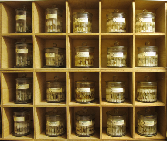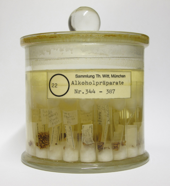 Psychidae - Alkoholsammlung Die Sammlung der Psychidae-Weibchen in Alkohol umfaßt heute rund 50 Glasschliffbehälter mit cirka 1800 Glasröhrchen mit großteils Individuen in Serie und dürfte damit der umfassendste Fundus an derartigem Material sein. ![]() ![]() ![]() Psychidae-Weibchen werden üblicherweise in Glasröhrchen konserviert, die mit einem Gummi- oder Kunststoffstopfen, früher Korkstopfen, fest verschlossen sind. Die Glasröhrchen werden meist zusammen mit den anderen getrockneten Imagines und Säcken in Insektenkästen verwahrt. Die Konservierungsflüssigkeit, 70%iger Alkohol, hält sich oft über Jahrzehnte, nicht selten aber verdunstet sie binnen weniger Jahre und so sind letztendlich die oft unwiederbringlichen Präparate dem Schicksal des Austrocknens ausgeliefert. Aus diesem Grund werden Alkoholpräparate grundsätzlich bei Erhalt in Standardglasröhrchen überführt, die, verschlossen mit einem Wattepfropfen, mit der Öffnung nach oben in mit Alkohol gefüllte Glastöpfe mit eingeschliffenem Deckel eingestellt werden. Somit muß nun nur noch ein bis zweimal jährlich kontrolliert werden daß der Alkoholpegel in den Töpfen die Öffnungen der Röhrchen übersteigt. Unter diesen Voraussetzungen ist eine Konservierung des Materials auf Dauer gewährleistet. Die Röhrchen sind am Boden mit der Präparatenummer versehen so daß die Präparate leicht aufzufinden sind, wenn man von unten durch den Glasboden des Topfes schaut. Die Präparatenummer steckt im Sammlungskasten an entsprechender Stelle, sodaß der Bezug hergestellt ist. Analog wie bei den Genitalpräparaten sind die Daten der Präparate im Computer erfaßt und können nach verschiedenen Suchkriterien gefunden werden. |