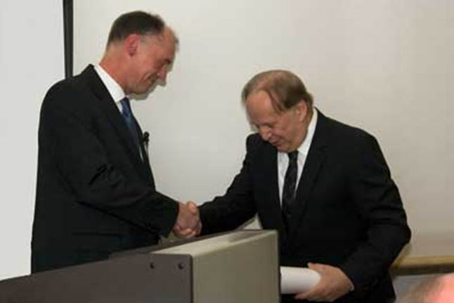 ![]() Prodekan Prof. Dr. Jörg Nickelsen bei der Überreichung der Ehren-doktorurkunde an Dipl.-Kfm. Thomas J. Witt |