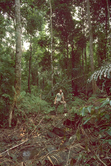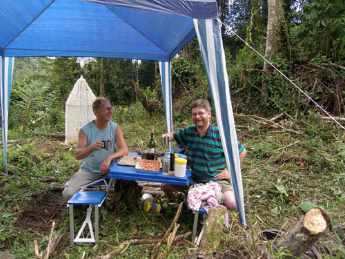 ![]() ⇑ Abb. 1. J. Lourens and Schintlmeister (right) celebrating the rediscovery of the fabulous Tarsolepis kochi Semper in Mindanao, Surigao del sur, Liangga, 8 km W of Diatagon (8°42’N, 126°05’E) in 2005 with a bottle of red wine in the virgin lowland forest. Abb. 2. Schintlmeister in 1988 in central Mindanao, Talakag, Mt. Binansilang (7°55’N, 124°40’E), type locality of many moths, including Saturniidae, Notodontidae and Sphingidae. ⇒ |