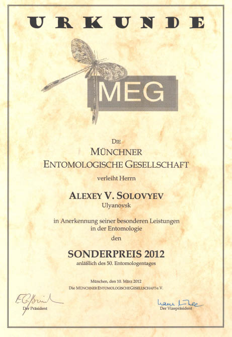 Alexey SOLOVYEV erhielt anläßlich des 50. Bayerischen Entomologentages am 10. März 2012 in München den Sonderpreis 2012 in Anerkennung seiner besonderen Leistungen in der Entomologie.![]() |